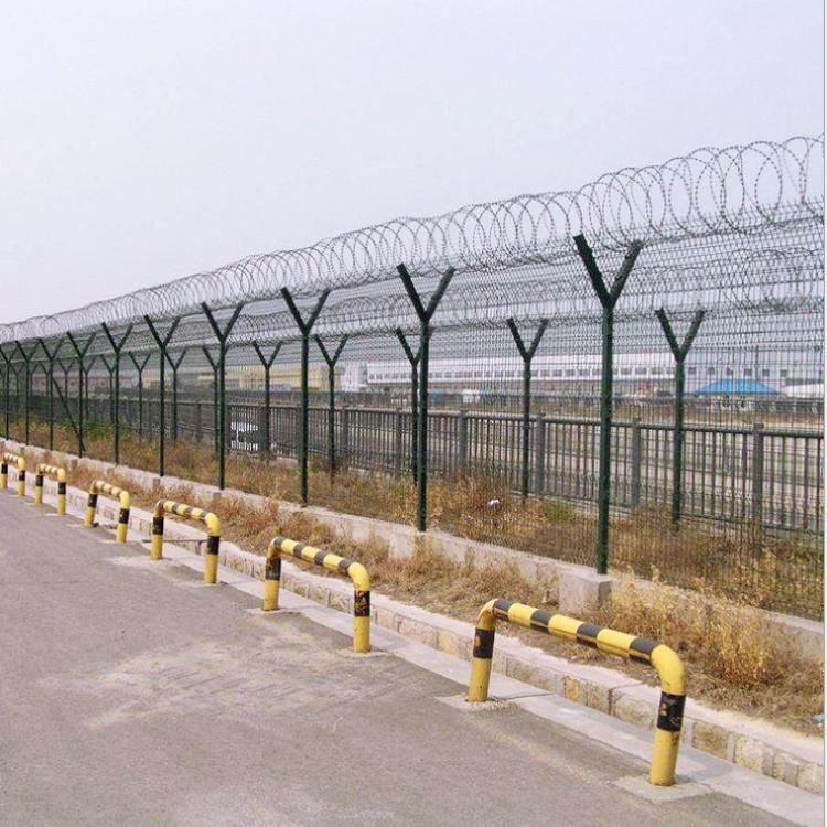 機(jī)場(chǎng)圍界網(wǎng)多為Y型立柱 +鋼筋焊接網(wǎng)片+蛇腹式刀刺網(wǎng)組成,雖然大多數(shù)時(shí)候叫做機(jī)場(chǎng)圍界、機(jī)場(chǎng)鐵絲網(wǎng)圍界或者機(jī)場(chǎng)防護(hù)網(wǎng),但是這類(lèi)防護(hù)網(wǎng)不只是應(yīng)用在機(jī)場(chǎng)。由于這種結(jié)構(gòu)有很好的隔離和防攀爬功能,可以應(yīng)用在很多地方。蛇腹型刀刺網(wǎng)呈螺旋狀,一般多為鍍鋅和不銹鋼材質(zhì),結(jié)構(gòu)新穎、堅(jiān)固緊密、網(wǎng)面平整、網(wǎng)孔均勻、刀鋒銳利、防攀爬、抗腐蝕性強(qiáng)。