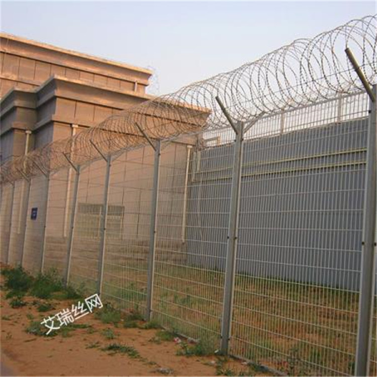 防攀爬金屬鋼網(wǎng)墻網(wǎng)加蛇腹形螺旋雙交叉式刀刺網(wǎng)。