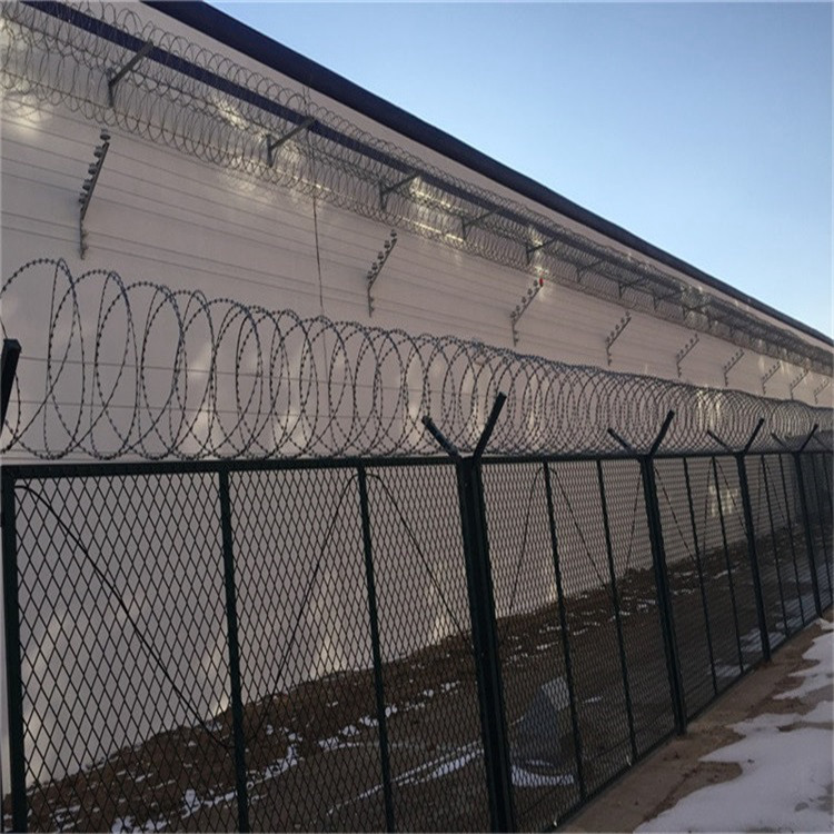 (4)蛇腹型刀刺網(wǎng)與V型托網(wǎng)之間用適量固定卡子或用2-3條直徑3.0m不銹鋼絲加固,鋼絲穿過V型托(預(yù)留孔)拉直固定刀刺分布均勻,距離<15cm;分段連接處需將兩端刀刺網(wǎng)做連接固定,刀刺網(wǎng)固定點需緊鎖,不得出現(xiàn)松動、脫落觀象;上下左右均威直線延伸,轉(zhuǎn)角處需做加密加固處理。