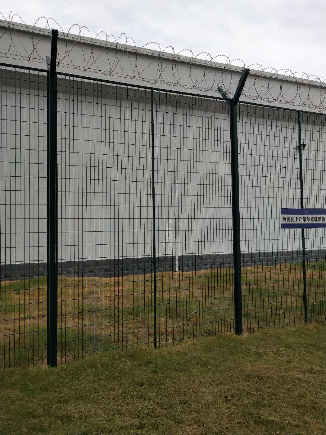 少管所灰色浸塑隔離網(wǎng)圍墻內(nèi)5米處4.5米高防攀爬金屬隔離網(wǎng)及刀刺網(wǎng)常用規(guī)格:單位(mm絲徑:4.0mm-6.5mm