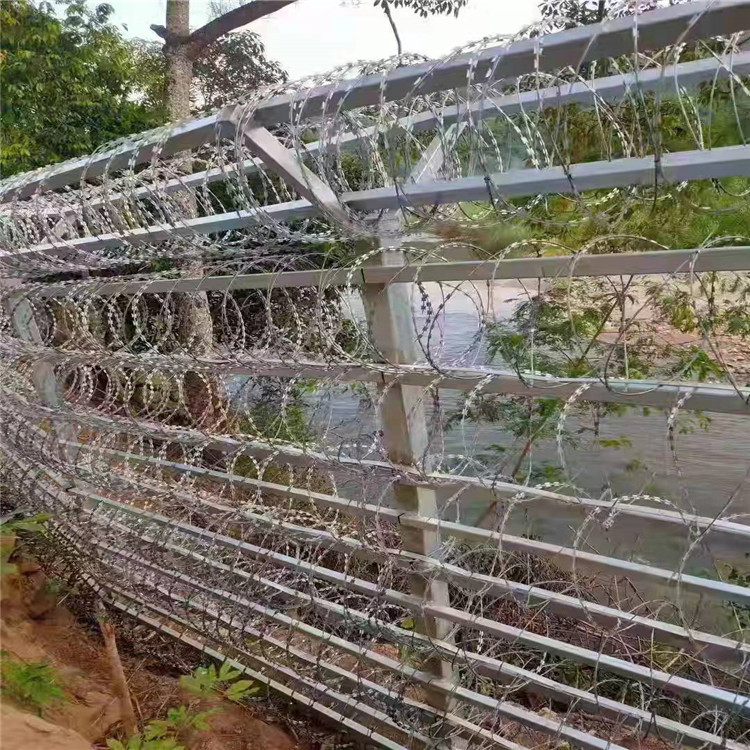 直條型刀片刺網(wǎng)產(chǎn)品類似于鐵絲刺繩,只不過刺的位置為刀片狀,一般3米長一根,立柱間距也為三米,其長度也可依客戶要求制作。安裝完成能夠構建一道防護墻,深受監(jiān)獄等防護性的場所使用,其外觀顏色可以隨意搭配,具有美觀防護作用。