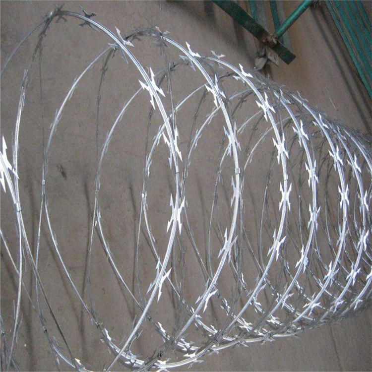 Y型架上邊架蛇腹型刀刺:由熱鍍鋒鋼板或不銹鋼薄板沖壓出尖利的刀片狀,高張力鍍鋅鋼絲或者不銹鋼絲做芯線組合而成的阻盡器材。刀刺直徑采取50-60厘米,刀型整潔、刀片鋒利、排列均勻致密、連接堅(jiān)固、防腐才能強(qiáng),可能達(dá)到防攀越、防拆卸***高保險(xiǎn)等級(jí)。