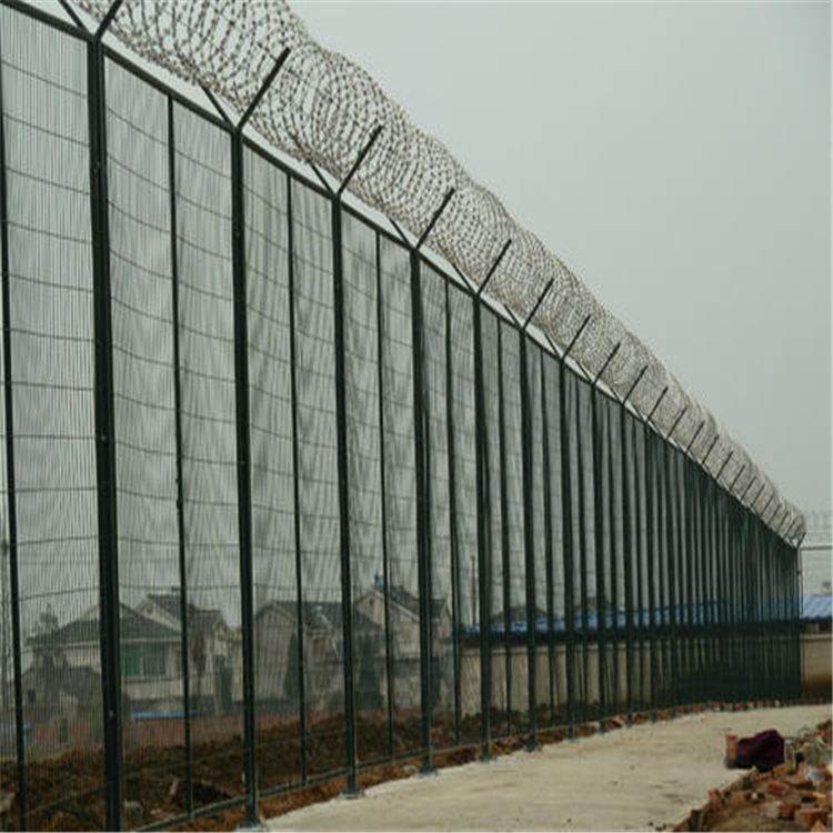 監(jiān)獄防爬鋼圍網(wǎng)V型支架加裝防拆卸刀刺網(wǎng)。刀刺網(wǎng)的直徑一般為500mm、600mm、800mm,材質(zhì)均為優(yōu)質(zhì)304不銹鋼,鎳含量8個以上。刺網(wǎng)芯線直徑為2.5mm、刀片長22mm,刀片寬度15mm,刀片厚度0.5mm。蛇腹形刀刺網(wǎng)的排列密度不小于16圈/米,相鄰每圈間距不大于120mm。監(jiān)獄用的刀刺網(wǎng)通??壑g的距離是120mm,直徑500mm的刀刺網(wǎng),覆蓋一米的重量約為2.38公斤(其他直徑的覆蓋長度可以詳細(xì)詢問安平縣艾瑞金屬絲網(wǎng)有限公司業(yè)務(wù)部,向您詳細(xì)解答)。