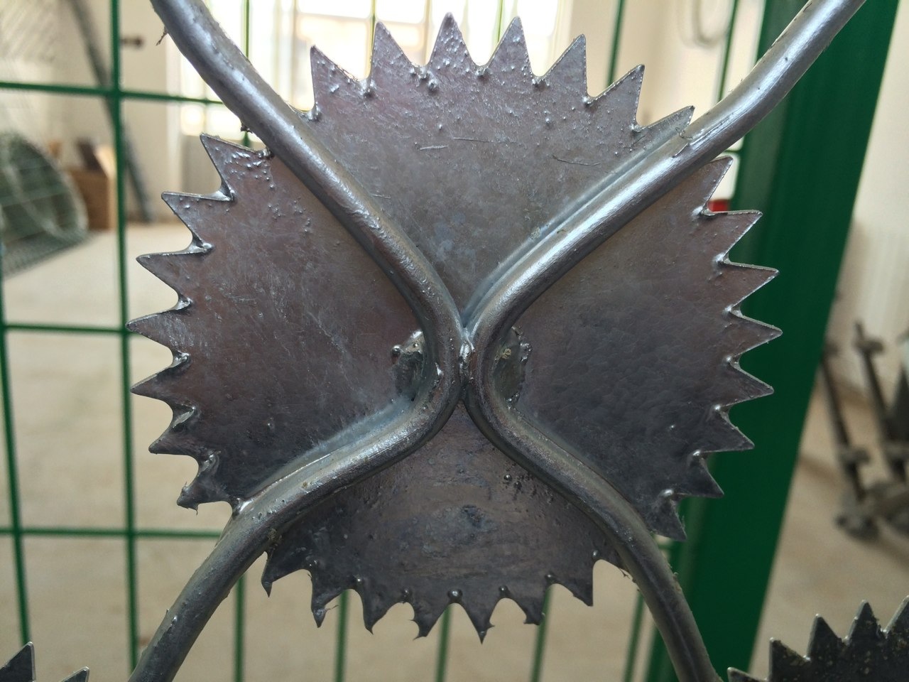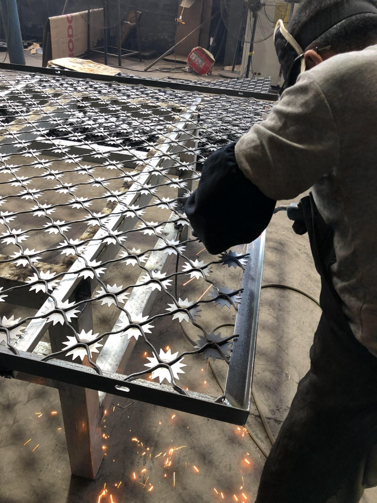 監(jiān)獄梅花刺片隔離網(wǎng)為單層梅花刺片網(wǎng),直徑不小于7.5cm,刺片厚1.5mm,采用Q235低碳鋼板沖壓成型。網(wǎng)片為菱形網(wǎng)孔,網(wǎng)格尺寸;120mm*110mm(高*寬),網(wǎng)絲直徑8mm,采用S195線材高壓焊接,每一個(gè)焊點(diǎn)附焊梅花刺一個(gè)。