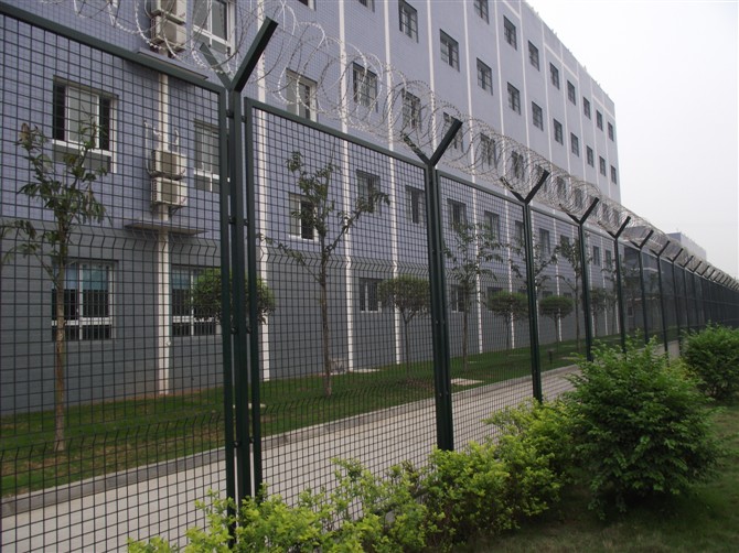 監(jiān)獄巡邏道鋼網墻,監(jiān)獄通透式防爬網,監(jiān)獄高圍墻頂端鋼網墻由鋼絲網片、立柱及安裝底座法蘭盤三部分組成。鋼絲網片外部由角鋼圍成2米長矩形框架,內部焊接鋼絲組成一個整體。高圍墻頂端建有巡邏道的,鋼網墻固定在巡邏道內護墻里側;立柱為方形,高2.6米(含巡邏道高度),立柱在巡邏道以上部位與網片通過使用防盜不銹鋼螺絲進行穿絲連接,立柱在巡邏道以下部位焊接一個法蘭盤和2-3個吊耳固定在巡邏道內護墻里側,立柱底端深入墻體100mm。高圍墻頂端未建巡邏道的,立柱為圓柱形,高2.5米,在圍墻頂端架設安裝槽,安裝槽為廠字形鐵片,厚10mm,寬220mm,圍墻內、外垂直地面方向400mm(長)×220mm(寬),安裝槽下方使用2個螺栓穿過墻體進行連接,圍墻頂部水平方向長度比圍墻厚度略小,鋼網墻立柱底部焊接220mm×220mm法蘭盤通過四根膨脹螺栓穿過安裝槽與墻體連接。1、建有巡邏道的鋼網墻網片:∶ 2000mm(長)×1300mm(高)(巡邏道內護墻高1.2米為準。內護墻大于或小于1.2米的,內護墻高度加上鋼網墻網片高度之和不小于2.5米為準)。