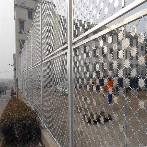 梅花刺網(wǎng)又稱監(jiān)獄護(hù)欄網(wǎng)或監(jiān)獄隔離柵,主要是采用高強(qiáng)度的刀片刺網(wǎng)與普通防護(hù)網(wǎng)的結(jié)合,由V型支架立拄,加強(qiáng)型焊接片網(wǎng),安全防盜連接件和刀片刺網(wǎng)組成.刀片刺網(wǎng)是一種新型防護(hù)網(wǎng),由銳利尖角鍍鋅鋼板或不銹鋼薄板做刀片,鋼絲做芯線組合而成的防護(hù)器材梅花刺網(wǎng)又稱高安全防護(hù)網(wǎng)、監(jiān)獄防護(hù)網(wǎng),是用氬弧焊將梅花形刺片焊接在美格網(wǎng)的節(jié)點(diǎn)上,形成刺形保護(hù),有效的防止了手握腳攀,為此該鋼網(wǎng)墻在監(jiān)獄或看守所使用。