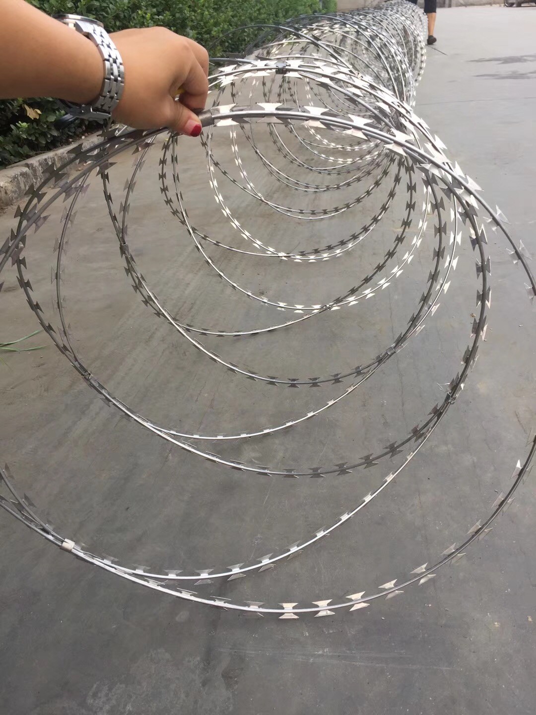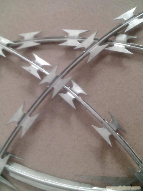 螺旋型交叉式刀片刺絲是在兩條刀片刺絲之間以不銹鋼片和鍍鋅鋼片強(qiáng)勃夾和,展開后即成交叉狀,取其美觀又實(shí)用。