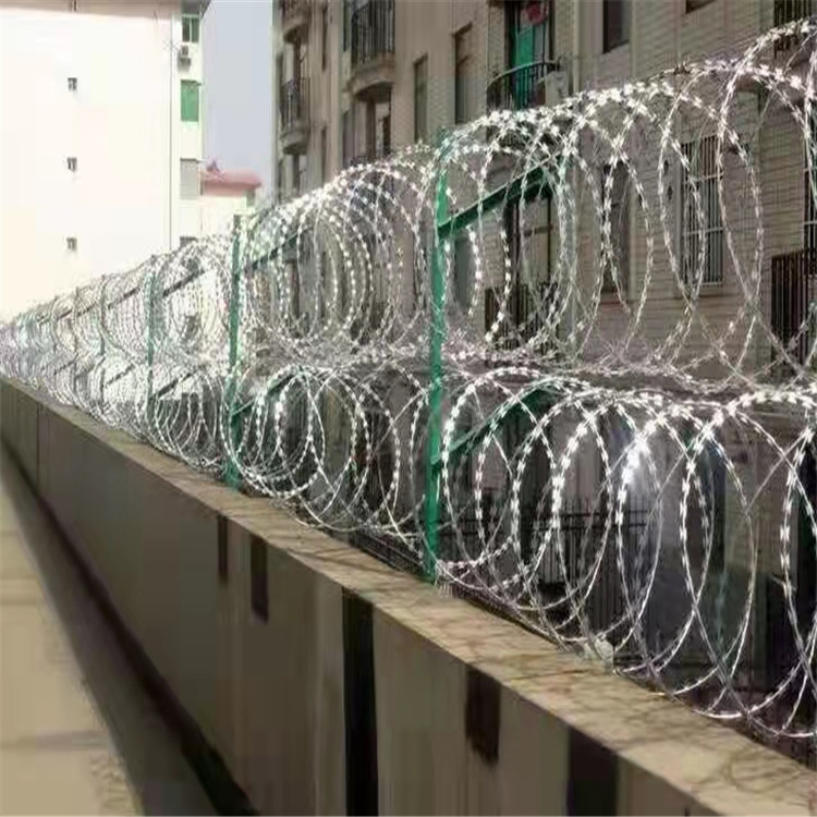 刺絲滾籠的上鋅量是有特殊要求的,現(xiàn)在市面上銷售的基本上都是每平米40-50克的上鋅量的普通產(chǎn)品,高鐵上面應(yīng)用的話一般環(huán)境選用的是120克上鋅量,特殊環(huán)境選用的是250克甚至是270克以上的產(chǎn)品,無論是板材還是里面包裹的內(nèi)絲都必須保證這個上鋅量--星宇刺繩廠15075898878。 (1)、刺絲滾籠采用刀片刺繩繞圈后相臨兩圈每隔120°用刺絲連接卡固定,張開后形成蛇腹網(wǎng)狀,閉合后刀片刺繩圈徑為50cm,張開后每交叉圈安裝間距20cm,直徑不小于45cm。(2)、刀片刺繩由沖切鋼板采用機(jī)械壓軋在鋼絲上成型,刀刺寬度22mm,兩刃垂直間距15mm,刀刺縱向間距34mm,芯絲直徑為2.5mm。刀片采用厚度0.5mm的Q195鋼板沖切制作,芯絲由HPB300?6.5mm高線鋼絲加工。(3)、刺絲滾籠由刺絲連接卡扣與固定在支架上的縱向拉筋相連接,縱向拉筋與支架的連接采用?2.5mm的冷拔鍍鋅鋼絲繞2圈后擰緊固定,支架設(shè)置在跨度3m防護(hù)柵欄的立柱和跨中位置,其他跨度僅設(shè)置與立柱上部,支架與防護(hù)柵欄采用支架抱箍連接。(4)、刺絲滾籠的下緣距離鋼筋混凝土防護(hù)柵欄上緣的垂直距離為0.05m。