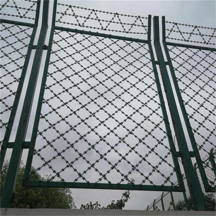 4.V型頂端安裝刀片刺網(wǎng),直徑采用50cm-60cm刀片刺網(wǎng)主要是由熱鍍鋅鋼板或不銹鋼薄板沖壓而成的,它擁有尖銳的刀片,高張力鍍鋅鋼絲或者不銹鋼絲做芯線組合而成的產(chǎn)品。