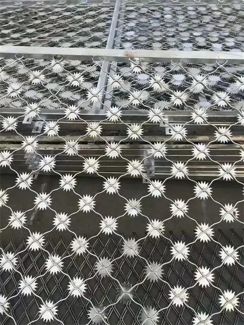 太陽(yáng)花刺片美格網(wǎng)常用于監(jiān)獄鋼網(wǎng)墻制作,是非常堅(jiān)固牢靠防攀爬的太陽(yáng)花刺片美格網(wǎng)鋼網(wǎng)墻,在日常生活中,我們熟悉的美格網(wǎng)就是居民家中防盜窗那樣的,孔型優(yōu)美.牢固,不過我們今天說的美格網(wǎng)和工平常接觸的美格網(wǎng)可不一樣。我們今天說的美格網(wǎng)在每個(gè)交點(diǎn)處都焊接了太陽(yáng)花刺片。刺片采用太陽(yáng)花形狀設(shè)計(jì),此設(shè)計(jì)不僅美觀大方,而且具有極強(qiáng)的防護(hù)力。每個(gè)刺片有14個(gè)花刺,焊接固定在美格網(wǎng)上。由于花詞密集不易觸摸,一般作用于監(jiān)獄、看守所、戒毒所等等做為外網(wǎng)、大門通道等等。下面是太陽(yáng)花刺片監(jiān)獄鋼網(wǎng)墻的材料介紹。
