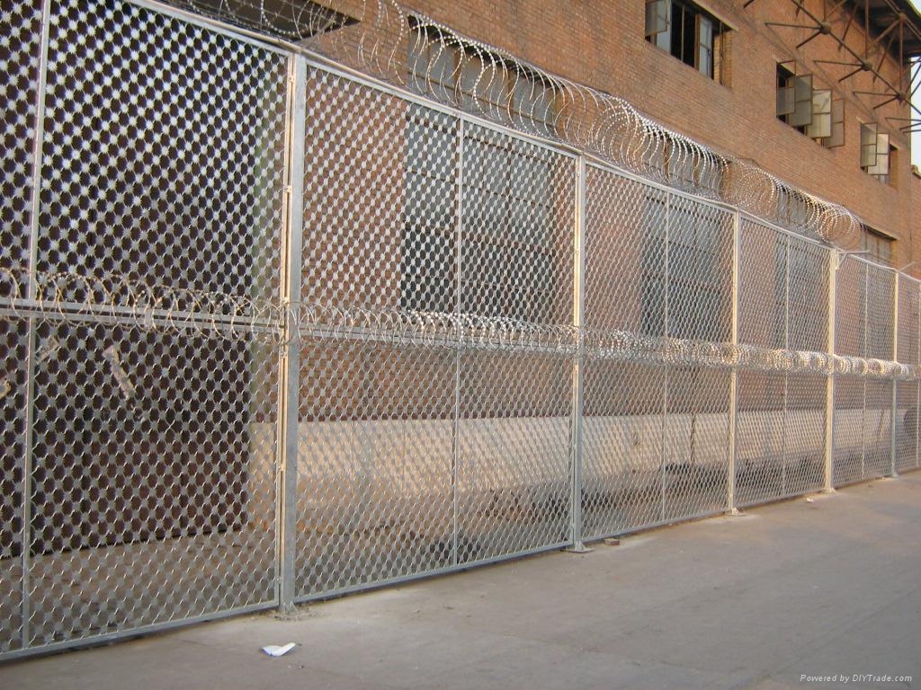 梅花刺隔離網(wǎng)又叫沖壓刺隔離網(wǎng)、太陽(yáng)花刺片隔離網(wǎng),行業(yè)內(nèi)簡(jiǎn)稱梅花刺網(wǎng)。其特點(diǎn)為堅(jiān)固牢靠、防止攀爬等。梅花刺隔離網(wǎng)一般用于監(jiān)獄大門,探監(jiān)門,人員通道兩邊的隔離網(wǎng),由于其成本造價(jià)高,所以還沒有廣泛替代焊接式隔離網(wǎng)。整體架構(gòu)由美格網(wǎng)+梅花刺片、邊框、立柱、刀刺網(wǎng)組成