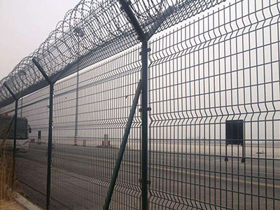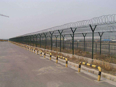機場護欄網(wǎng)又稱作“Y型安全防御護網(wǎng)”,是由V型支架立柱加強型焊接片網(wǎng),安全防盜連接件和熱鍍鋅刀片刺網(wǎng)組成強度和安全防御性級別很高。被廣泛應(yīng)用在機場,軍事基地等高安全場所。