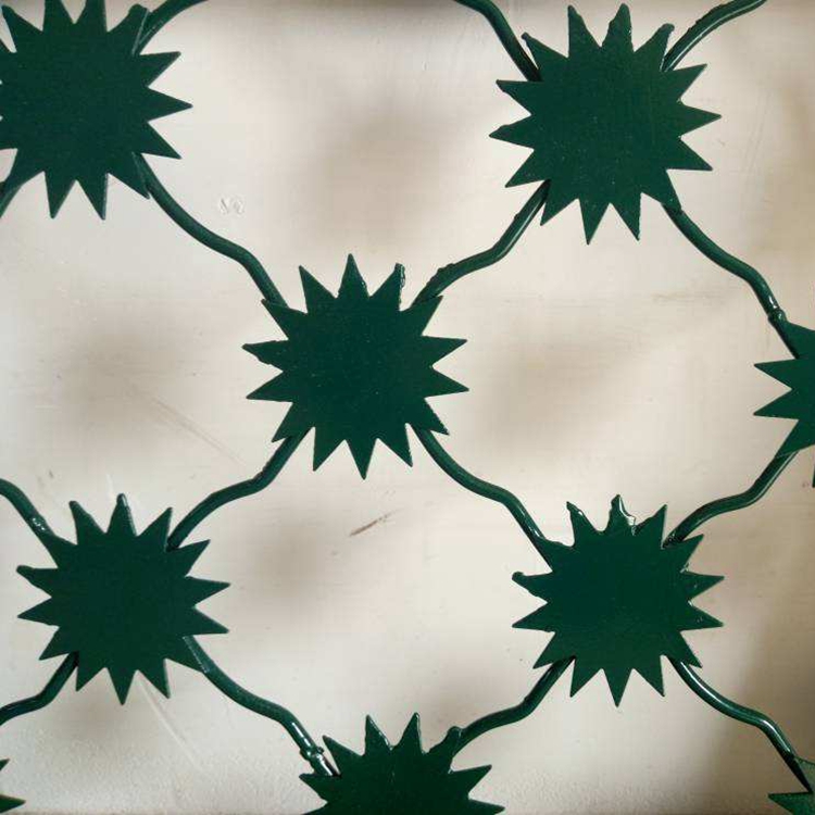 監(jiān)獄梅花刺網(wǎng)防攀爬能力強(qiáng)主要是因為它有梅花形狀的刺,太陽花形狀設(shè)計此設(shè)計不僅美觀大方,而且具有極強(qiáng)的防護(hù)力。太陽花防護(hù)網(wǎng)中每個花瓣都是由網(wǎng)的橫、豎兩根主鋼筋相交截割制成,花心及花干部分則為輔助鋼筋固定,將網(wǎng)格尺寸調(diào)整、加強(qiáng)牢固。因為噴塑的塑層比較薄,不會形象梅花刺的形狀,從而達(dá)到防攀爬效果。