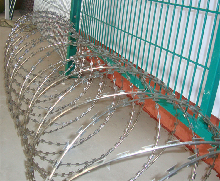 刀片刺絲是沖剪鋼板成銳利的尖刀帶子,然后包裹中碳鋼絲(筋絲)之上。刀片刺絲是從海外引進(jìn)的絕對(duì)禁止通過(guò)的新型隔離產(chǎn)品。鋒利的刀片刺絲由雙根線扣卡子組裝后成蛇腹?fàn)?,讓人看到不寒而粟,能夠起到了恐嚇作用,?shí)際上人挨上刀片刺絲就被劃破,實(shí)際效果明顯。該產(chǎn)品施工便利快捷。深受軍隊(duì)和警察喜好。各國(guó)已將刀片刺網(wǎng)廣泛用于飛機(jī)場(chǎng)、軍事重地、邊境線、監(jiān)獄、政府機(jī)關(guān)、銀行,以及別墅的圍墻、高速公路、鐵路護(hù)欄等地。