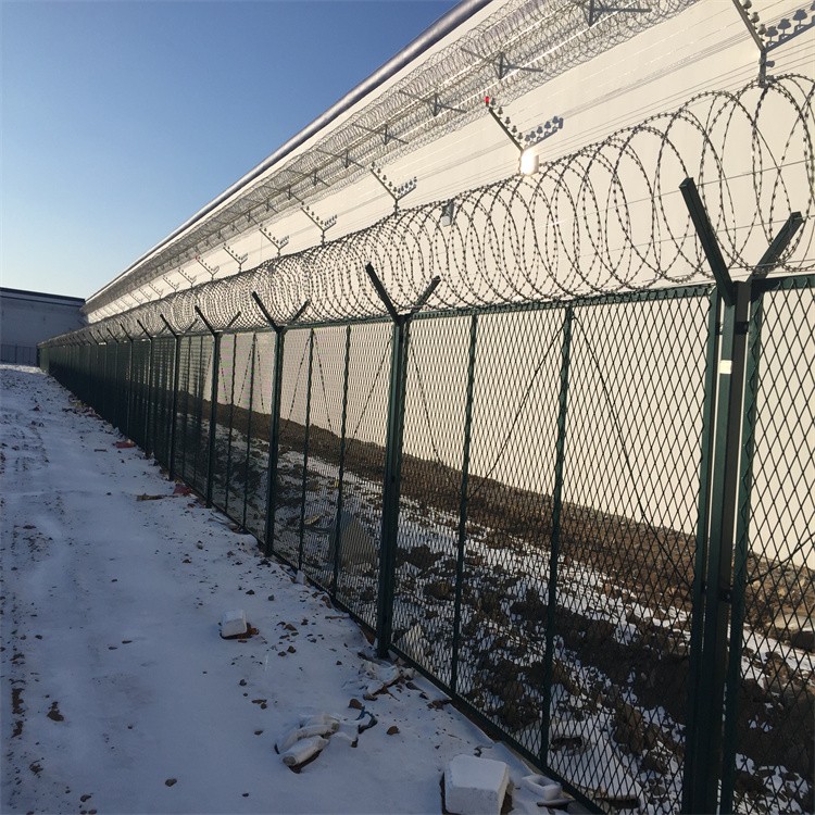 監(jiān)獄鋼網(wǎng)墻也叫Y型安全防御網(wǎng),是由V型支架立柱、 加強(qiáng)焊接網(wǎng)片、防盜連接件和熱鍍鋅蛇腹式刺絲滾籠組成的安全防護(hù)性能很高的護(hù)欄