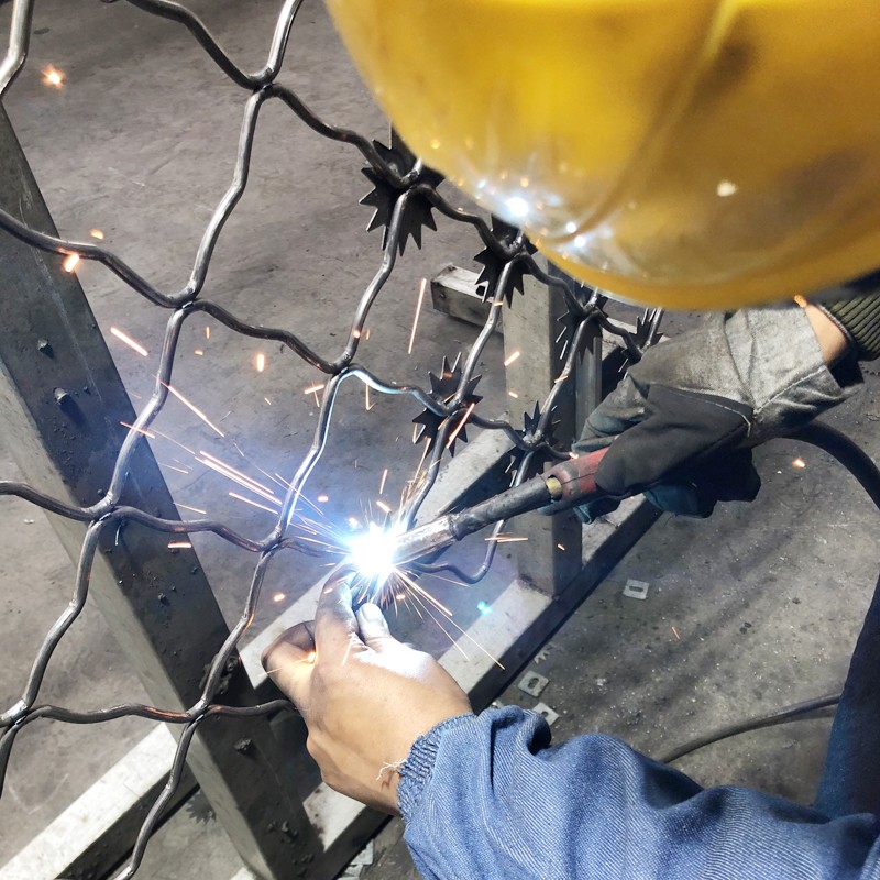 0195線材高壓焊接,每一個焊點附焊梅花刺一個。立柱采用Q235鋼管,規(guī)格:直徑80*80方管,方管厚度3mm。立柱高2.5米,間距3米,