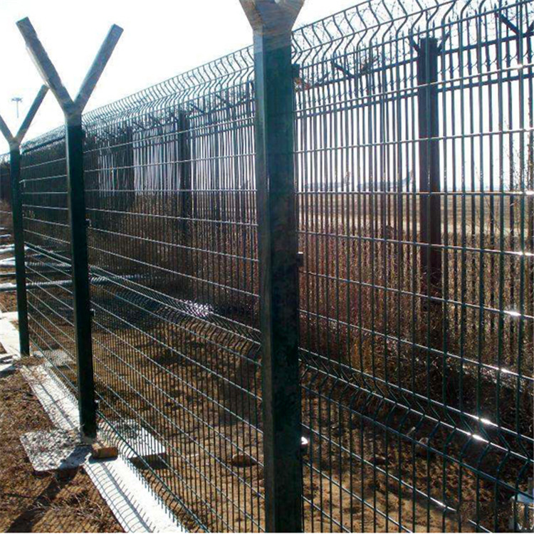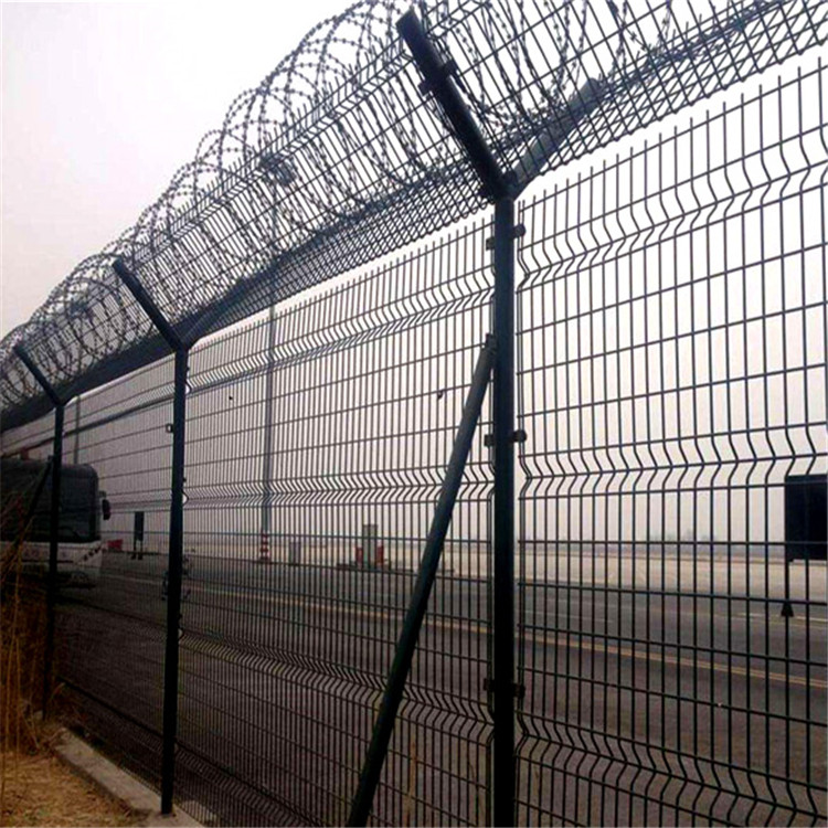 特點:如果在機場護欄網(wǎng)頂部加裝刀片刺絲、刀片刺繩后又很好的增強了安全防護性能。采用電鍍、熱鍍、噴塑、浸塑等防腐形式,具有很好的抗老化、抗曬、耐候等特點。其產(chǎn)品造型美觀、花色多樣,既起到圍欄作用,又起到美化作用。由于具有安全性高、防攀爬能力好,網(wǎng)片連接方式采用特制SBS緊扣件,有效防止人為的破壞性拆卸,橫向四道折彎加強筋,使網(wǎng)面強度顯著增加。