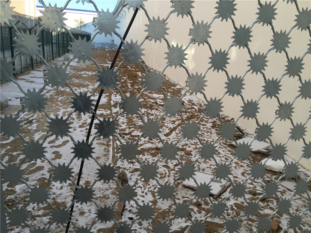 1、梅花刺片:梅花刺片直徑不小于7.0cm(直徑6cm、7cm、8cm),刺片厚1.2mm,采用Q235低碳鋼板沖壓成型。梅花刺片用氬弧焊將梅花形刺片焊接在美格網(wǎng)的節(jié)點上,形成刺形保護,有效的防止了手握腳攀。