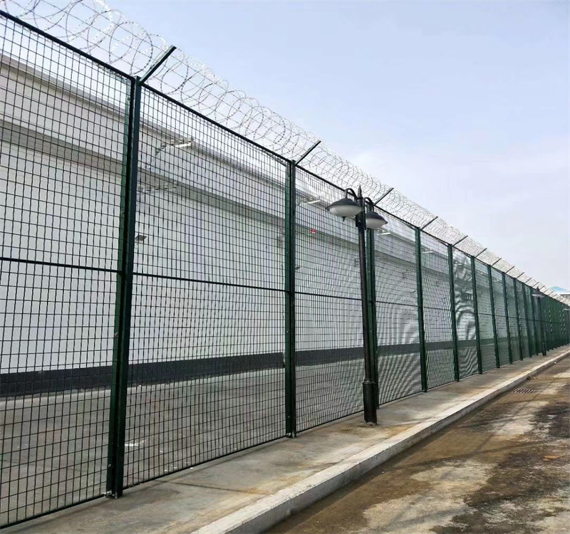 4. 鋼網(wǎng)圍墻:這種類型的監(jiān)獄鋼網(wǎng)墻使用鋼絲網(wǎng)作為圍墻的主要材料,鋼絲網(wǎng)通過(guò)焊接或綁扎在鋼管框架上。鋼網(wǎng)圍墻具有較高的透明度和通風(fēng)性,適用于需要較好的視野和通風(fēng)條件的監(jiān)獄。