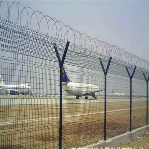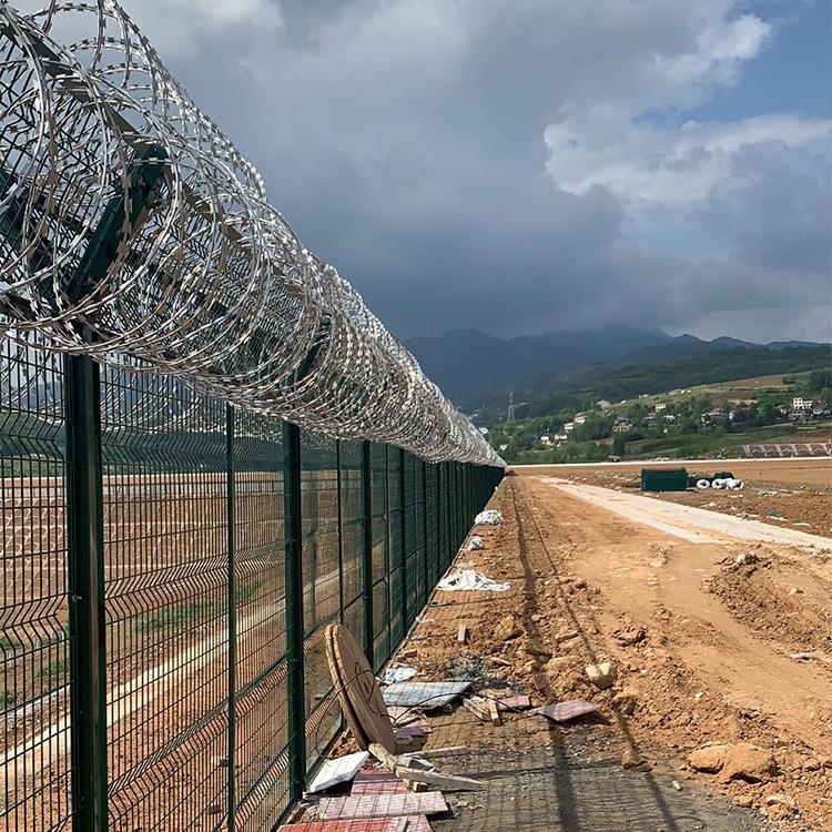機場圍界常用規(guī)格: 尺寸:2*3m(柱中到柱中) 網(wǎng)孔:5*10cm,5*20cm 立柱一般采用60X60、80X80的矩形鋼管,頂部帶有v字支架用來安放刀刺滾籠。 優(yōu)點:相較于傳統(tǒng)鋼筋混凝土墻來說,具有成本低易安裝施工,施工周期短等特點。