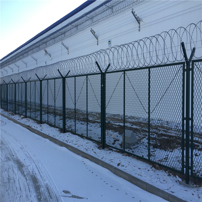 監(jiān)獄鋼網(wǎng)墻刀刺網(wǎng)片菱形孔要求豎向排列,網(wǎng)頁緊固牢靠、平整美觀,每單元網(wǎng)頁每側不少于六個連接固定點。蛇腹式刀刺網(wǎng)每圈刀刺間隔100mm,每米刀刺不少于10圈。刀刺網(wǎng)安裝固定卡扣整體調(diào)正,使刀刺網(wǎng)不出現(xiàn)擰轉情況,刀刺刺圈分布均勻,每隔20米與拉絲固定;分段連接處需將兩端刀刺網(wǎng)做連接固定,刀刺網(wǎng)固定點需緊鎖不得出現(xiàn)松動、脫落現(xiàn)象;刀刺網(wǎng)安裝與隔離網(wǎng)平行,上下左右均成直線延伸,轉角處需做加密加固處理。