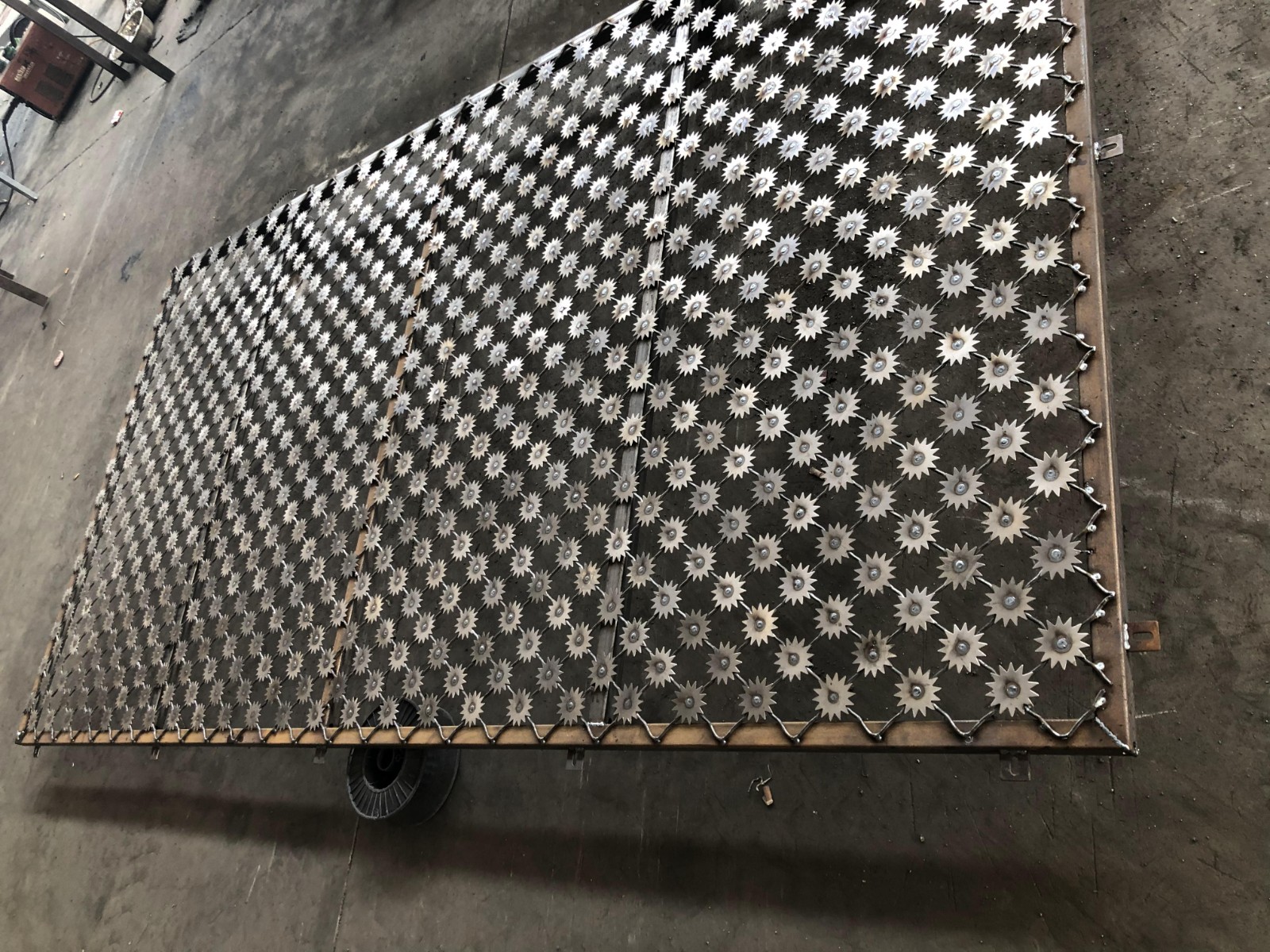 5.刀片滾網(wǎng)、拉絲、卡扣,均采用不銹鋼材質(zhì)。刀刺網(wǎng)安裝固定卡扣整體調(diào)正,使刀刺網(wǎng)不出現(xiàn)擰轉(zhuǎn)情況,刀刺刺圈分布均勻,每隔30-40cm與拉絲固定;分段連接處需將兩端刀刺網(wǎng)做連接固定,刀刺網(wǎng)固定點需緊鎖不得出現(xiàn)松動、脫落現(xiàn)象;刀刺網(wǎng)安裝與隔離網(wǎng)平行,上下左右均成直線延伸,轉(zhuǎn)角處需做加密加固處理。