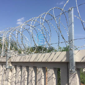 (3)、刺絲滾籠由刺絲連接卡扣與固定在支架上的縱向拉筋相連接,縱向拉筋與支架的連接采用?2.5mm的冷拔鍍鋅鋼絲繞2圈后擰緊固定,支架設(shè)置在跨度3m防護(hù)柵欄的立柱和跨中位置,其他跨度僅設(shè)置與立柱上部,支架與防護(hù)柵欄采用支架抱箍連接。