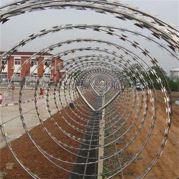 工藝:浸塑刀片刺繩支架是由圓管或方管切割成兩個(gè)臂長(zhǎng)為45cm的管,然后焊接到地盤上,組成v字型狀。所以叫v型支架,v型支架主要與刀片刺繩組合,給圍墻加一層保護(hù)膜。