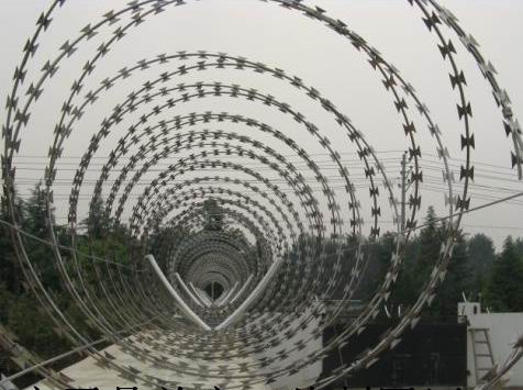 刀片刺繩的刀片是由尖利的鍍鋅鋼或不銹鋼制成。支架由相同規(guī)格的矩形鋼管制成。穿插環(huán)安裝相距20厘米,直徑至少為45厘米。刀片采用0.5mm厚Q195鋼板進(jìn)行模切,芯線為HPB300;采用6.5mm高線另一個(gè)跨度僅在列的頂部提供,并且支架和防護(hù)圍欄經(jīng)過(guò)支架環(huán)銜接。